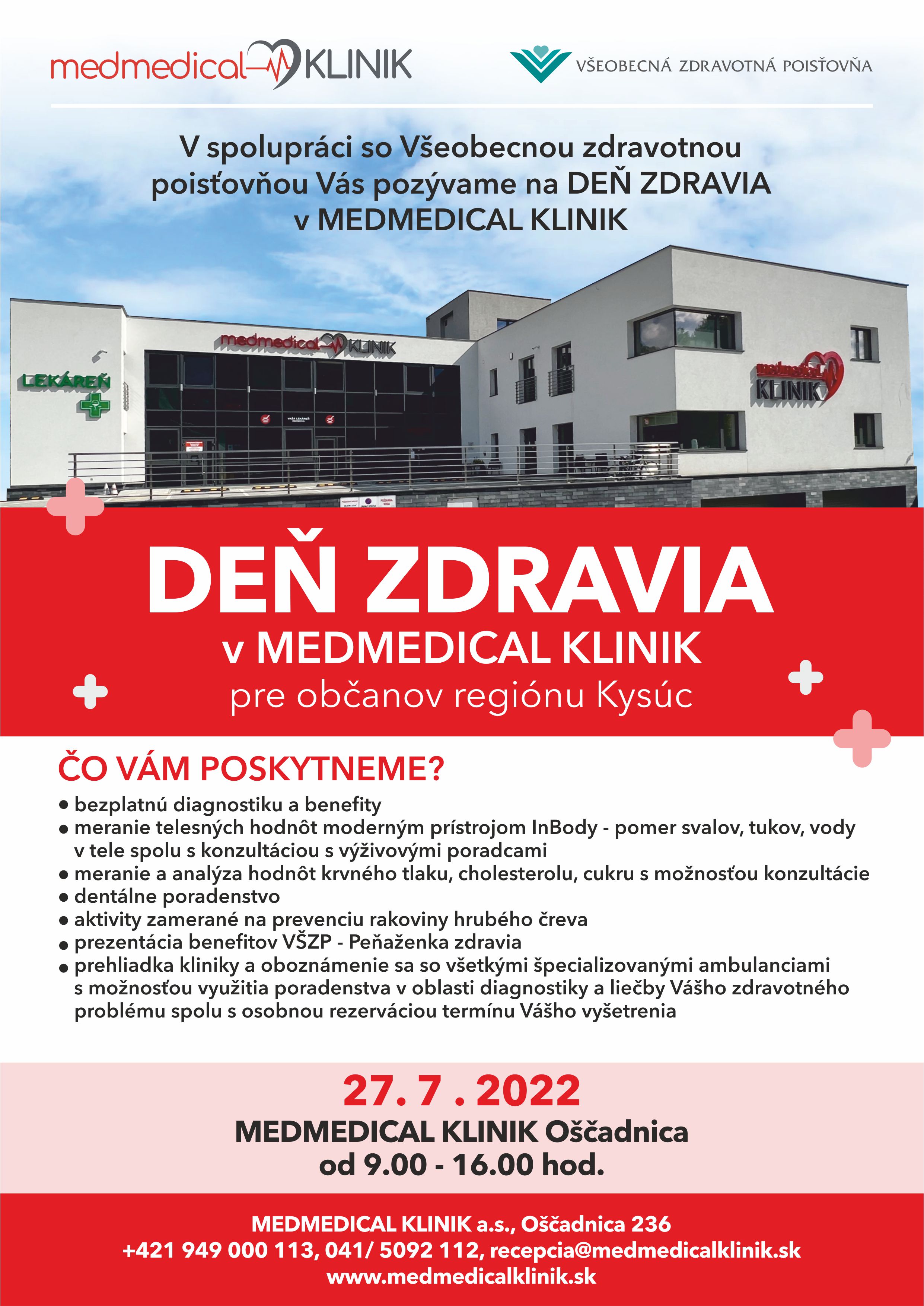 MEDMEDICAL KLINIK Oščadnica v spolupráci so Všeobecnou zdravotnou poisťovňou Vás 27. 07. 2022 v čase od 9:00 do 16:00 hod. srdečne pozývajú na podujatie Deň zdravia. Toto podujatie bude zamerané predovšetkým na bezplatnú diagnostiku, analýzu, edukáciu a prevenciu všetkých oblastí zdravia spolu s možnosťou využitia konzultácie výsledkov meraní s kvalifikovanými odborníkmi. Taktiež v rámci Dňa zdravia v MEDMEDICAL KLINIK budú mať návštevníci možnosť využiť množstvo iných aktivít, ktoré súvisia s diagnostikou a meraním dôležitých ukazovateľov súvisiacich so zdravotným stavom, a to: