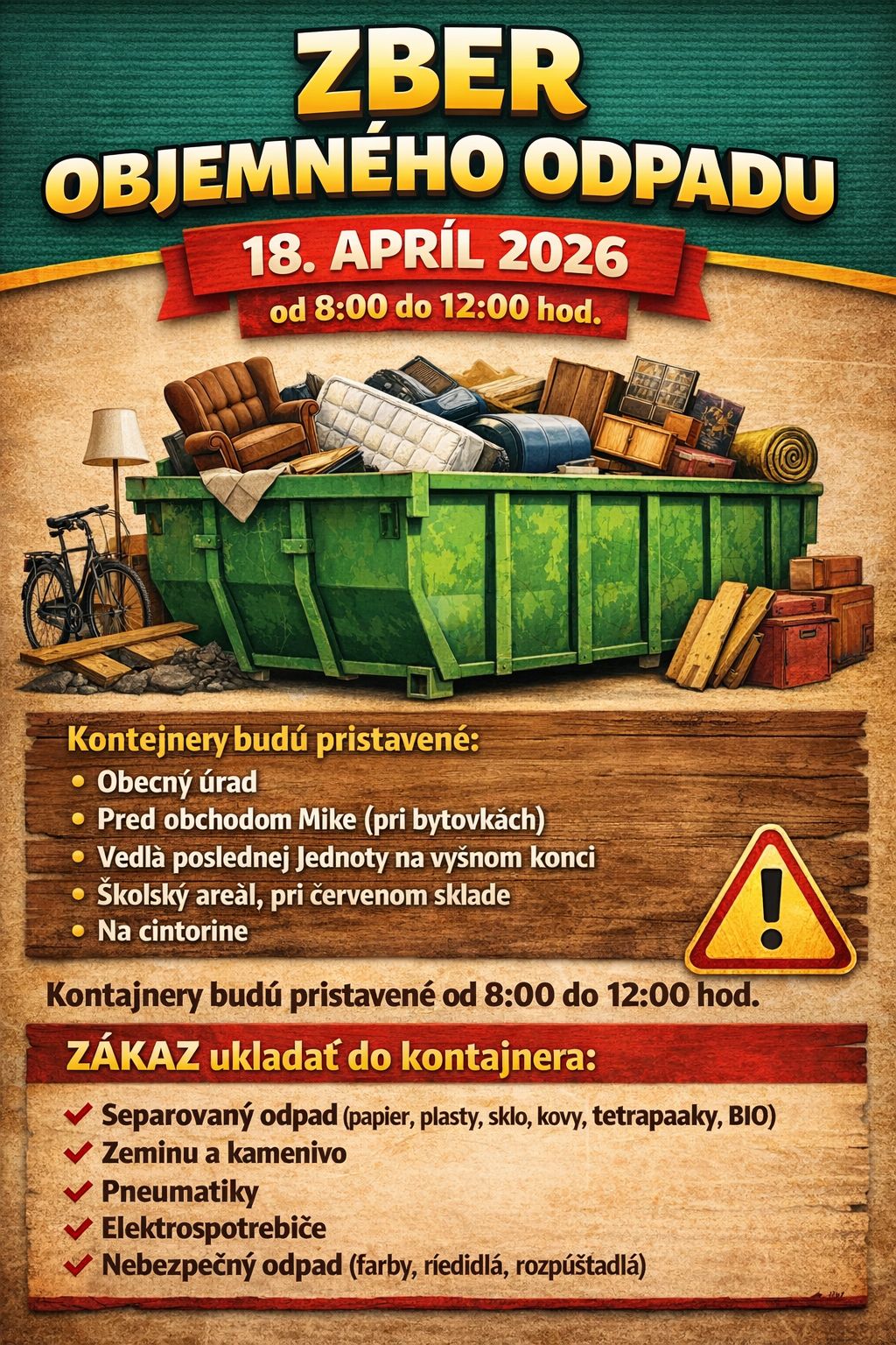 Zber objemného odpadu do veľkokapacitných kontajnerov sa realizuje pravidelne. Využite túto možnosť a prispejte k tomu, aby sme spoločne udržali našu obec čistú a bez nelegálneho odpadu v prírode.